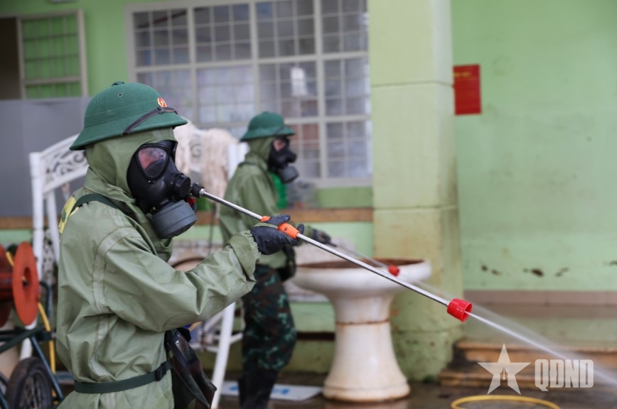 | Bộ đội phòng hóa khử khuẩn, tiêu độc sau lũ tại xã D’ran, tỉnh Lâm Đồng. |