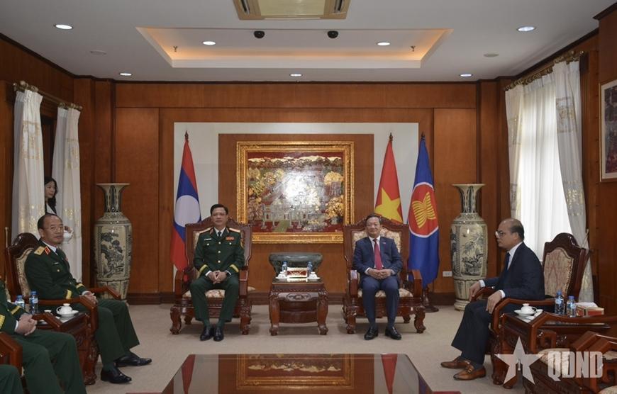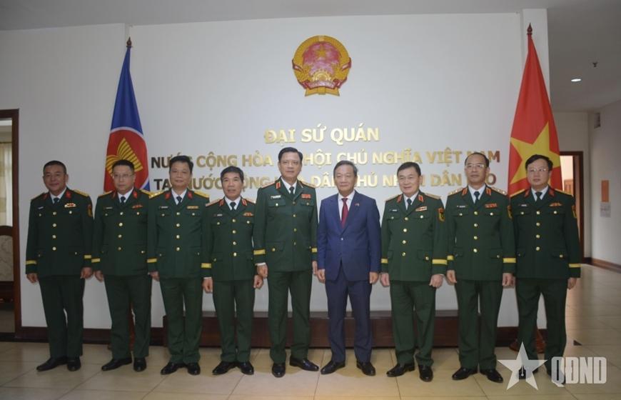 | Thượng tướng Nguyễn Trường Thắng và đoàn đại biểu Bộ Quốc phòng Việt Nam đến thăm làm việc tại Đại sứ quán Việt Nam tại Lào. |