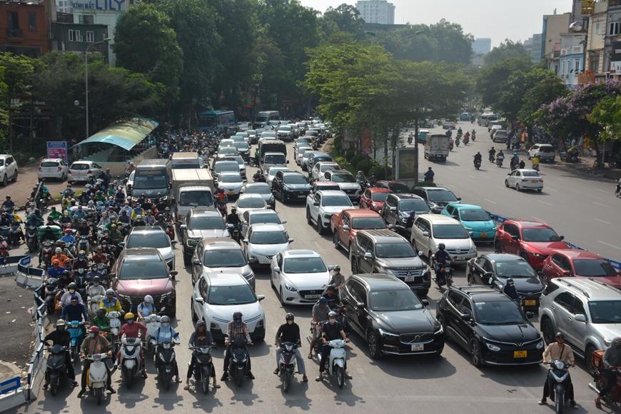 | Ô tô, xe máy chen chúc nhau tại khu vực Ngã Tư Sở vào giờ tan tầm hằng ngày. Ảnh: HỒNG SÁNG |