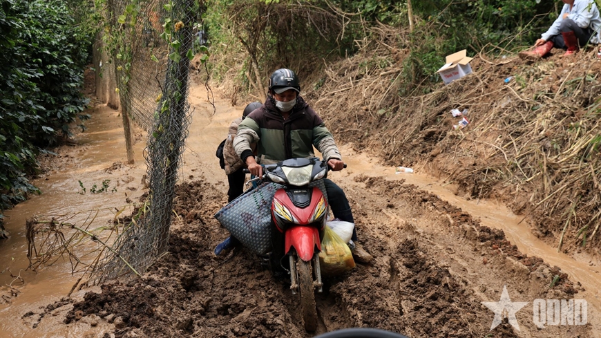 | Người dân địa phương mở đường tạm băng qua khu vực sạt lở trên đèo D'ran để vận chuyển nông sản và đi lại. |
