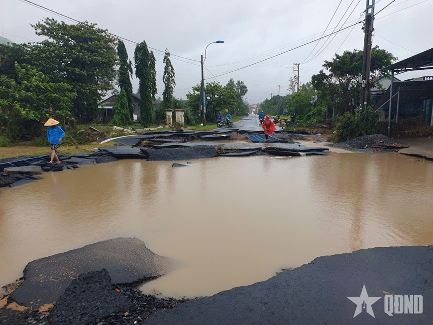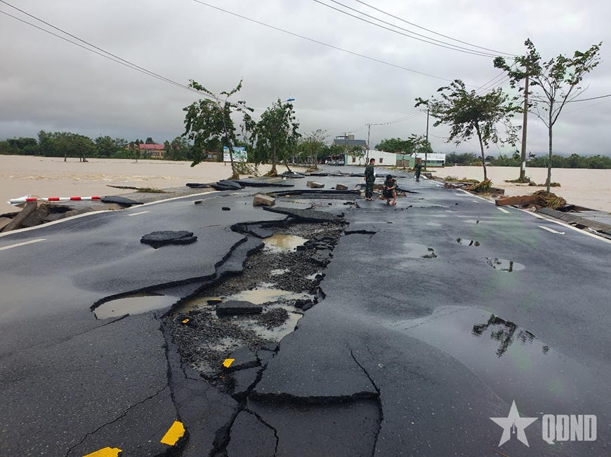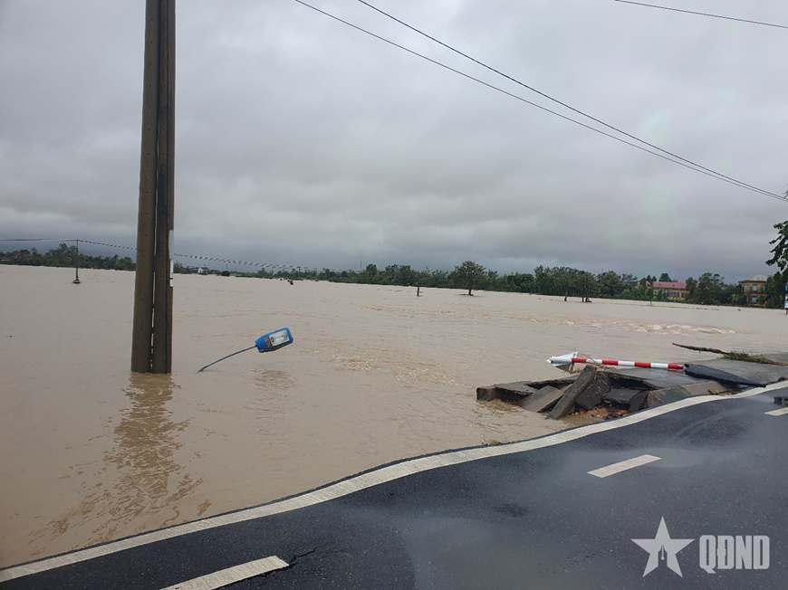 | Nước chảy xiết khiến một số đoạn đường bị sạt lở, hư hỏng, gây khó khăn trong cứu trợ cho người dân. |