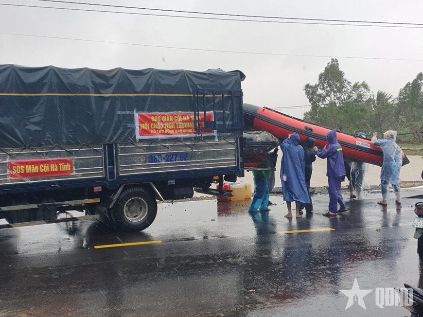 | Các lực lượng tham gia cứu trợ người dân ở xã Hòa Mỹ. |