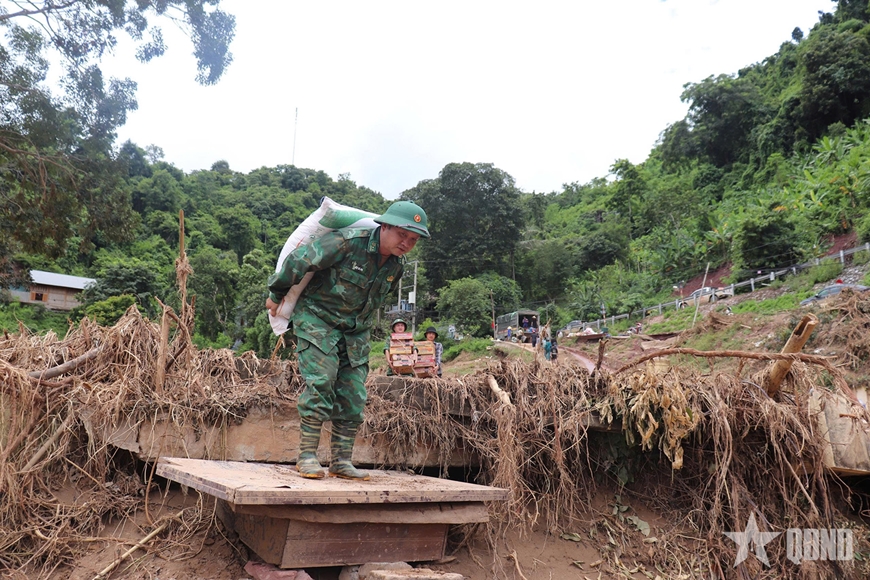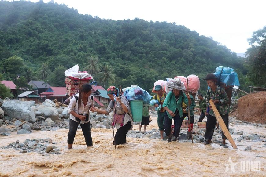 Chính quyền địa phương và các đơn vị LLVT vẫn miệt mài bám địa bàn, dốc toàn lực cùng bà con khắc phục hậu quả. Đường bộ bị chia cắt, họ không quản ngại gian nan, lội suối, băng rừng, đi bộ hàng chục cây số, có nơi phải dùng thuyền máy ngược dòng nước xiết mang theo từng bao gạo, thùng mì ăn liền, chai nước để tiếp sức cho bà con vực dậy sau thiên tai.