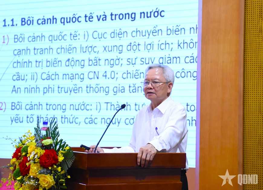 | GS, TS Tạ Ngọc Tấn, nguyên Ủy viên Trung ương Đảng, nguyên Giám đốc Học viện Chính trị Quốc gia Hồ Chí Minh, nguyên Phó chủ tịch Thường trực Hội đồng Lý luận Trung ương giới thiệu chuyên đề tại hội nghị. |