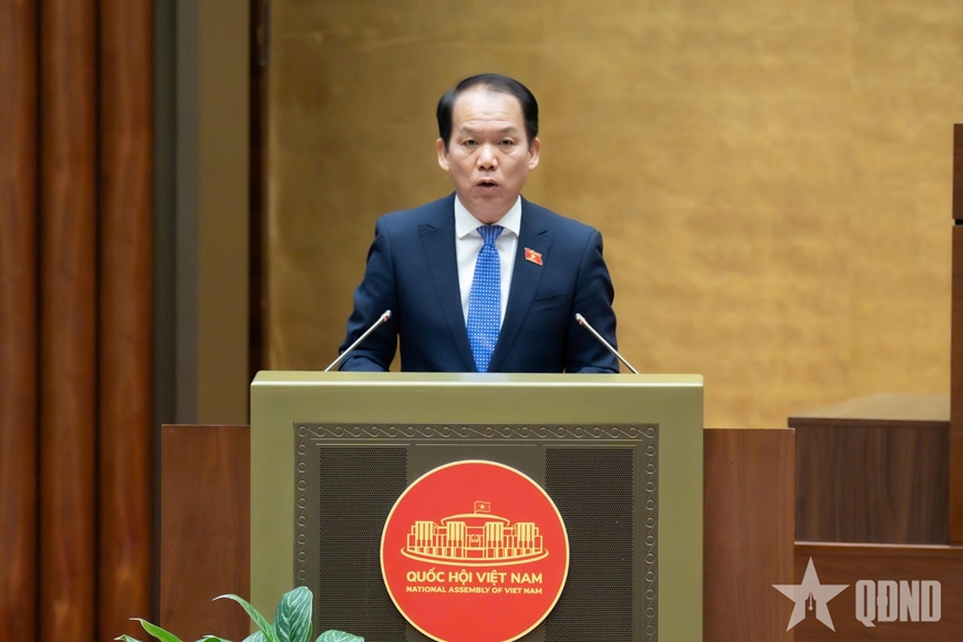 | Chủ nhiệm Ủy ban Pháp luật và Tư pháp Hoàng Thanh Tùng trình bày báo cáo. |