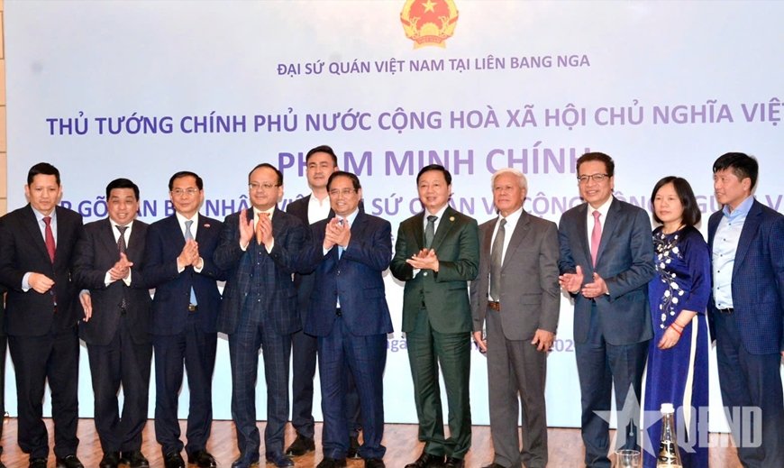 Tối 22-3 (giờ địa phương), trong khuôn khổ chuyến thăm chính thức Liên bang Nga, Thủ tướng Chính phủ Phạm Minh Chính đã gặp gỡ cán bộ, nhân viên Đại sứ quán và cộng đồng người Việt Nam tại Liên bang Nga.