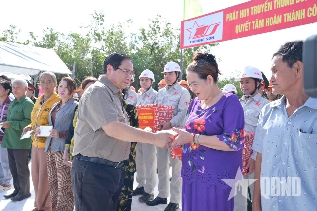 | Thủ tướng Phạm Minh Chính và đoàn công tác tặng quà các chủ đầu tư và đơn vị thi công các dự án chiến lược quốc gia tại xã Đất Mũi, tỉnh Cà Mau. |