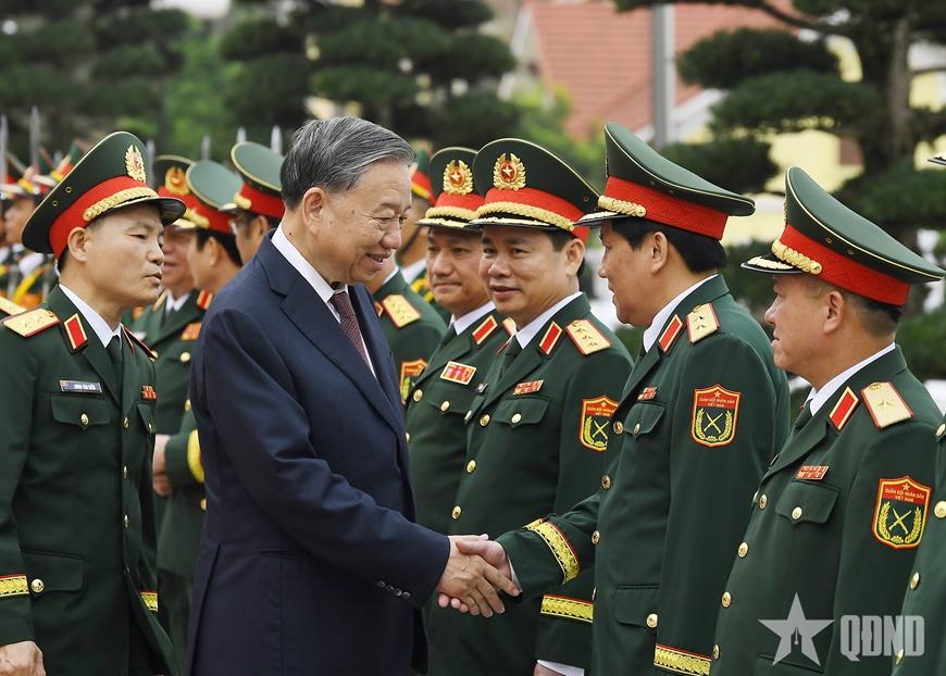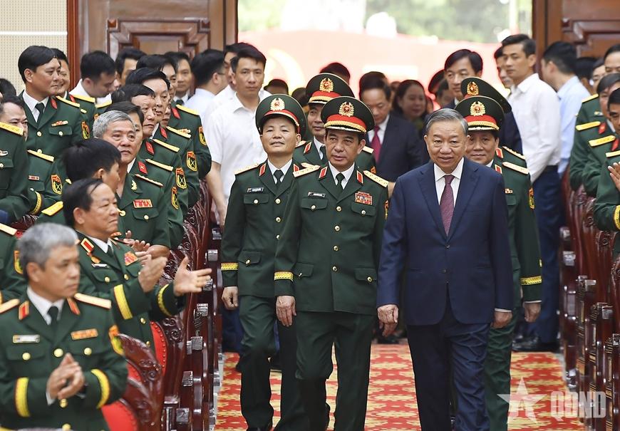 | Tổng Bí thư, Chủ tịch nước Tô Lâm với các đại biểu tham dự buổi lễ tại Quân khu 3. |