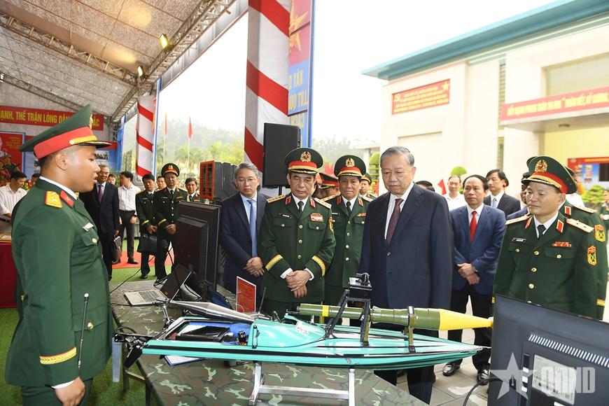 | Tổng Bí thư, Chủ tịch nước Tô Lâm và các đại biểu tham quan gian trưng bày tại Quân khu 3. |