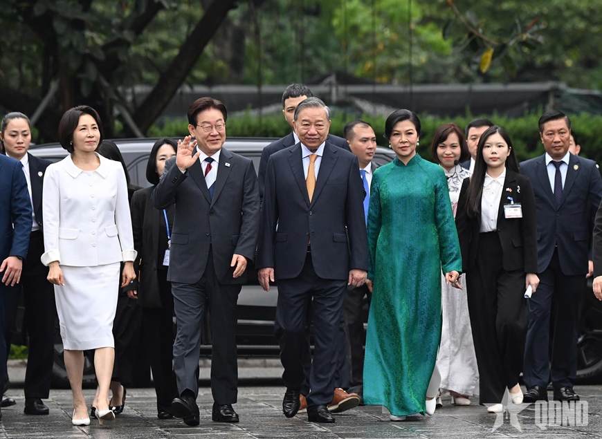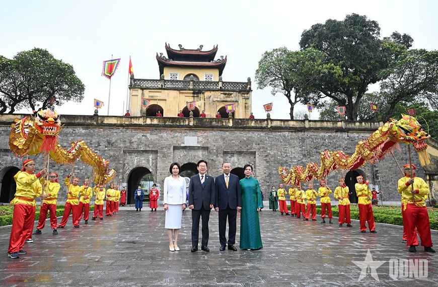 Trong không khí gần gũi và thân tình, thắm tình hữu nghị, Tổng Bí thư, Chủ tịch nước Tô Lâm và Tổng thống Hàn Quốc Lee Jae Myung cùng hai phu nhân đã di chuyển tới Cổng thành Đoan Môn. Đây là một trong những cổng thành chính dẫn lối vào Cấm thành Thăng Long - nơi ở và sinh hoạt của 52 vị tiên đế và hoàng gia trong liên tục 800 năm.