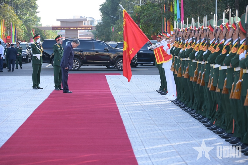 | Đại tướng Phan Văn Giang, Ủy viên Bộ Chính trị, Phó bí thư Quân ủy Trung ương, Bộ trưởng Bộ Quốc phòng cùng lãnh đạo Bộ Quốc phòng và Quân khu 9 đón Tổng Bí thư Tô Lâm. |
