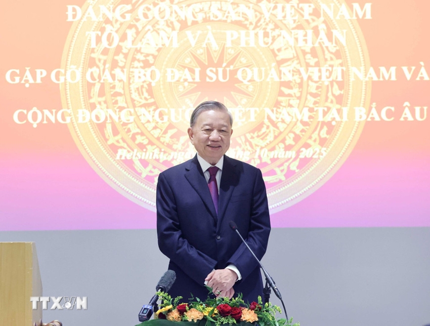 Trong khuôn khổ chuyến thăm chính thức Cộng hòa Phần Lan, chiều 21-10 (giờ địa phương), tại Helsinki, Tổng Bí thư Tô Lâm và phu nhân cùng Đoàn đại biểu cấp cao Việt Nam đã gặp gỡ cán bộ Đại sứ quán Việt Nam và cộng đồng người Việt tại các nước Bắc Âu (Phần Lan, Đan Mạch, Thụy Điển, Na Uy).