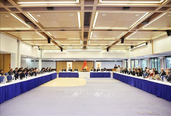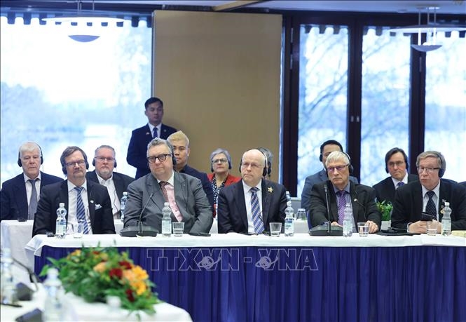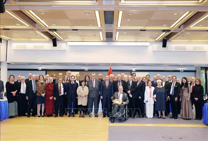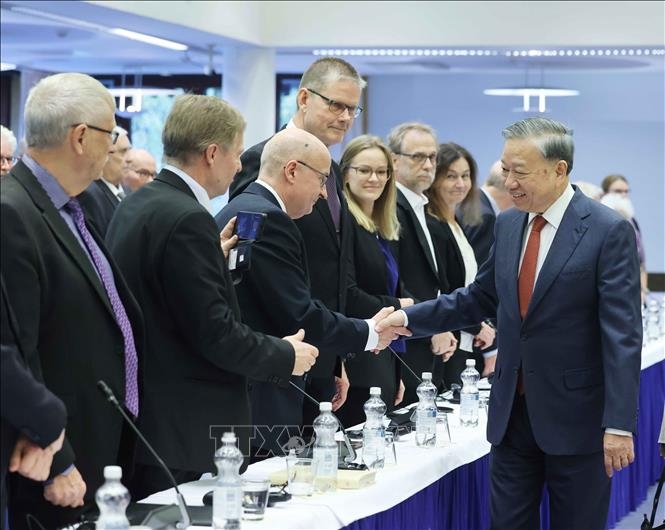 Tổng Bí thư Tô Lâm và đại biểu đoàn Việt Nam tại buổi tiếp Hội hữu nghị Phần Lan - Việt Nam và nhóm chuyên gia Phần Lan từng tham gia các dự án hỗ trợ tại Việt Nam. |
