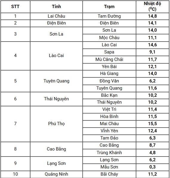 Nhiệt độ thấp nhất trong đợt không khí lạnh này ở khu vực Bắc Bộ và Thanh Hóa, phổ biến ở mức 10-12 độ C, riêng vùng núi 6-9 độ C, vùng núi cao có nơi dưới 3 độ C. Vùng núi cao các tỉnh Bắc Bộ đề phòng hiện tượng băng giá.
