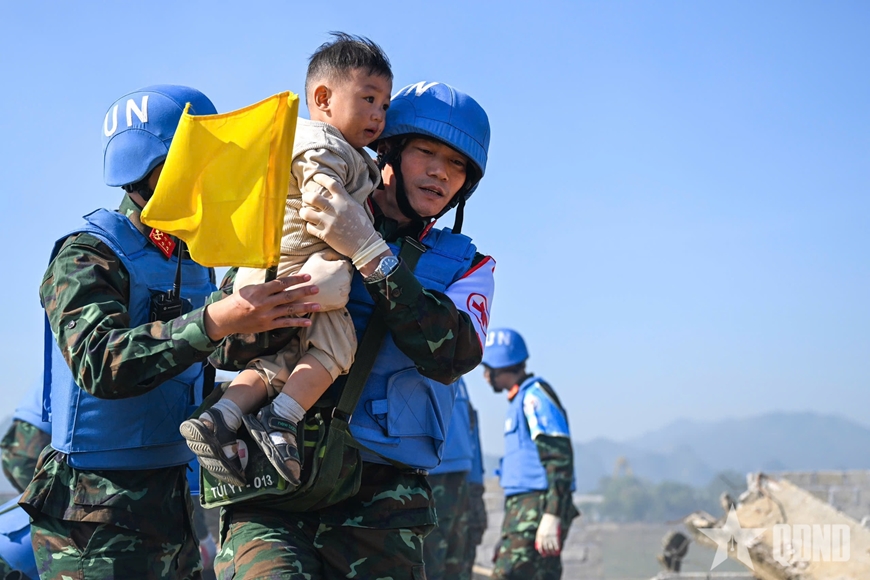 Bước sang tình huống thứ ba, Đội Công binh phối hợp cùng các lực lượng khác tiến hành cứu trợ nạn nhân do động đất, sập đổ công trình, tham gia cấp cứu và vận chuyển y tế đường không. Đây là tình huống đòi hỏi có sự phối hợp, hiệp đồng nhuần nhuyễn, đảm bảo chuyên môn cao. Bối cảnh tình huống là sau khi xuất hiện trận động đất 6 độ richter, nhiều vị trí trong doanh trại đóng quân bị rung lắc. Người đứng đầu chính quyền địa phương cho biết, Bệnh viện do UNICEF hỗ trợ xây dựng bị sập, đổ, bên trong có một số nạn nhân bị kẹt lại.