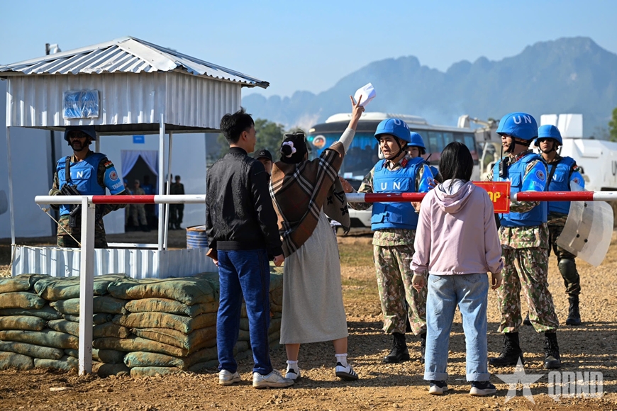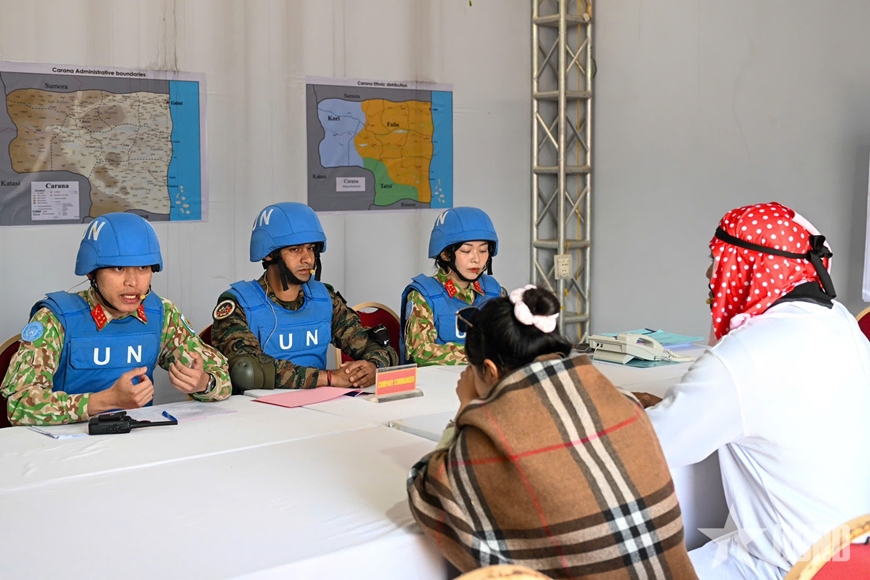 | Chỉ huy Đội Công binh cùng 2 Quan sát viên quân sự gặp người đứng đầu chính quyền địa phương và người phụ nữ cáo buộc bị quấy rối để đàm phán. |