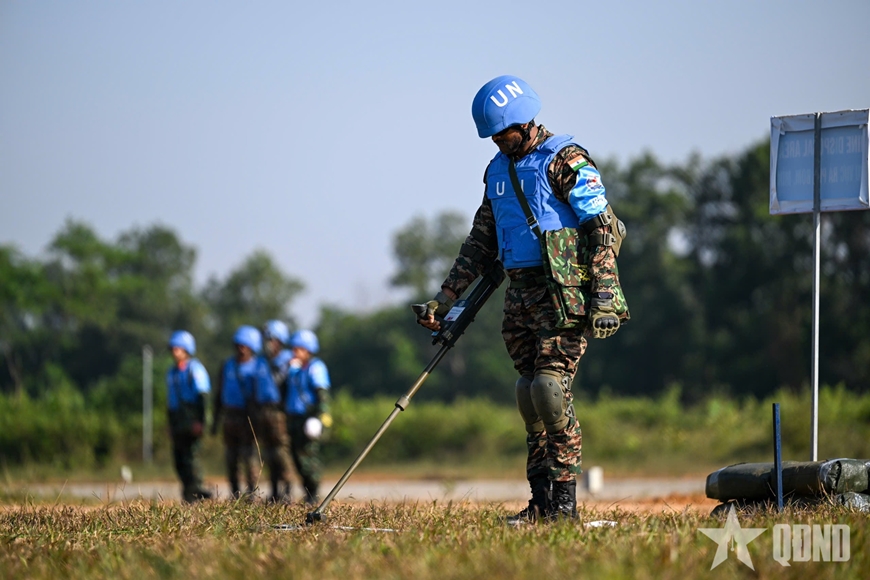 Trong tình huống giả định đầu tiên, Đội Công binh nhận nhiệm vụ khảo sát, rà tìm bom, mìn, vật liệu nổ tại khu vực gần doanh trại đóng quân của đội – nơi dự kiến Quỹ Nhi đồng Liên hợp quốc (UNICEF) sẽ hỗ trợ chính quyền và người dân địa phương xây dựng trường học.