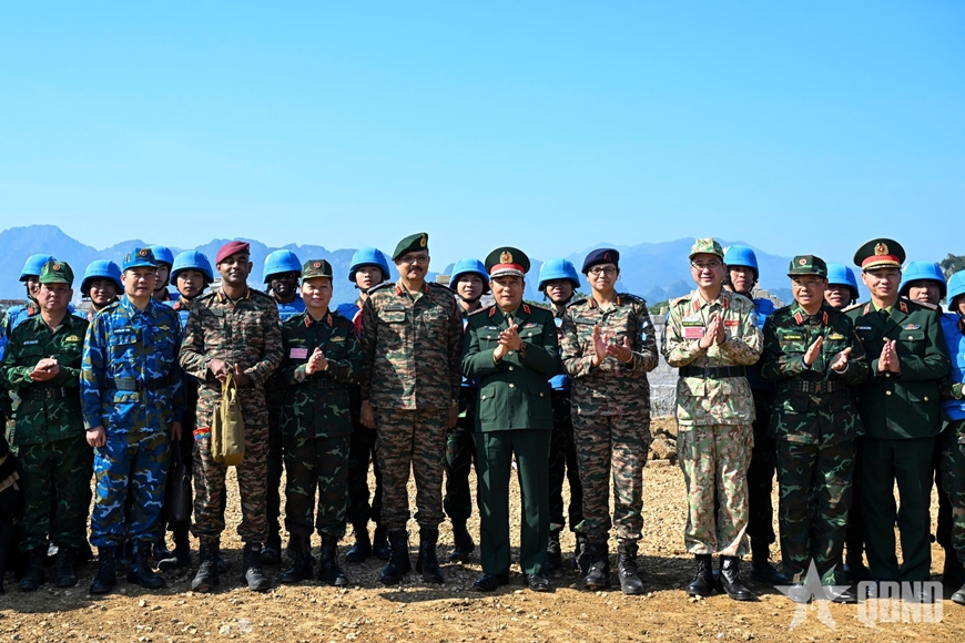 | Thượng tướng Phùng Sĩ Tấn, Thiếu tướng Rajdeep Singh Rawal, cùng các đại biểu chụp ảnh chung với lực lượng tham gia diễn tập. |