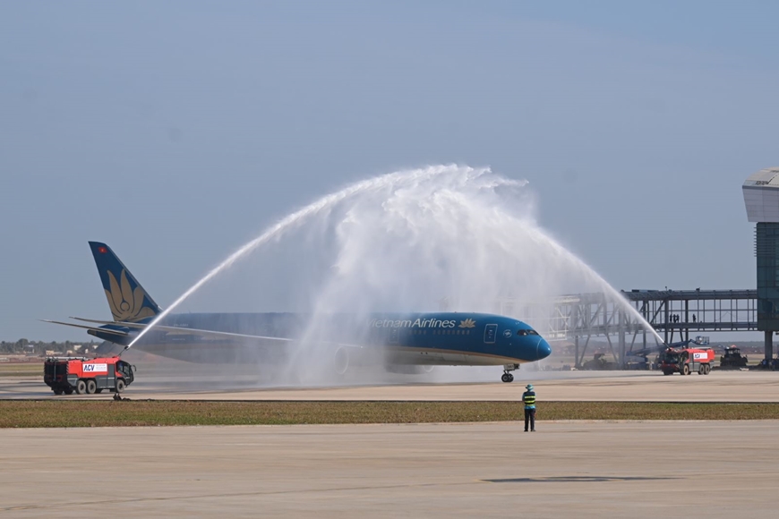 | Cảng hàng không quốc tế Long Thành được kỳ vọng tạo động lực tăng trưởng mới. Trong ảnh: Chuyến bay đầu tiên hạ cánh tại Cảng hàng không quốc tế Long Thành. Ảnh: Tổng công ty Cảng hàng không Việt Nam cung cấp |