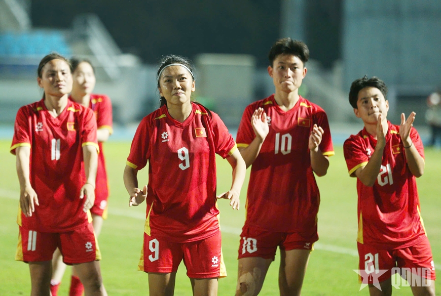 | Huỳnh Như (số 9) xúc động cảm ơn cổ động viên sau chung kết bóng đá nữ SEA Games 33. |