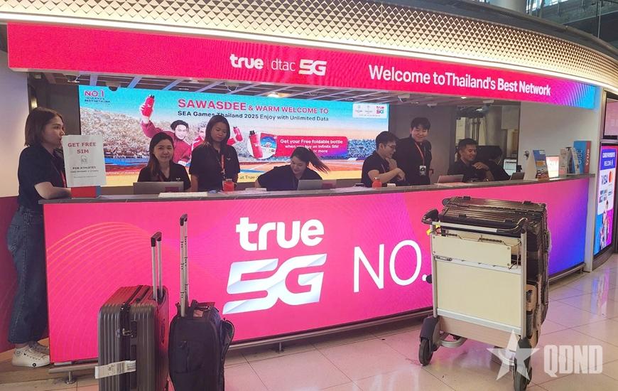 Người Thái Lan nổi tiếng giỏi làm du lịch và sự ấn tượng của du khách quốc tế đến từ những hành động nhỏ nhất. Ngay sau khi nhận hành lý và ra sảnh sân bay, chúng tôi bắt gặp rất nhiều khẩu hiệu về SEA Games. Đặc biệt, tại cổng số 10, hai quầy phát sim 5G miễn phí được Ban tổ chức chủ nhà bố trí bắt mắt. Toàn bộ những ai liên quan tới SEA Games 33 như huấn luyện viên, vận động viên, cán bộ đoàn, y tế, phóng viên... đều được tặng sim không giới hạn dung lượng internet.