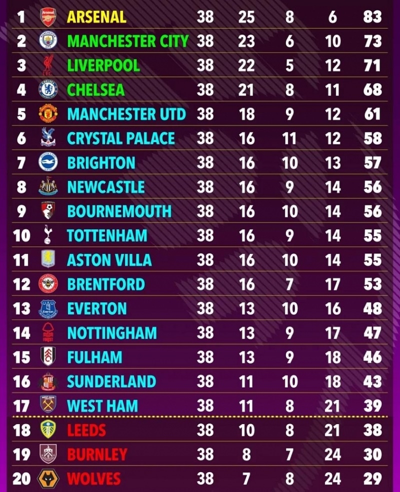 Arsenal đang dẫn đầu với xác suất vô địch lên tới 79%, trong khi Man City chỉ còn 12% sau thất bại trước Newcastle cuối tuần qua. Liverpool, mặc dù đang phải trải qua một giai đoạn khó khăn với phong độ thảm hại, được dự đoán sẽ trở lại mạnh mẽ và về đích ở vị trí thứ ba.