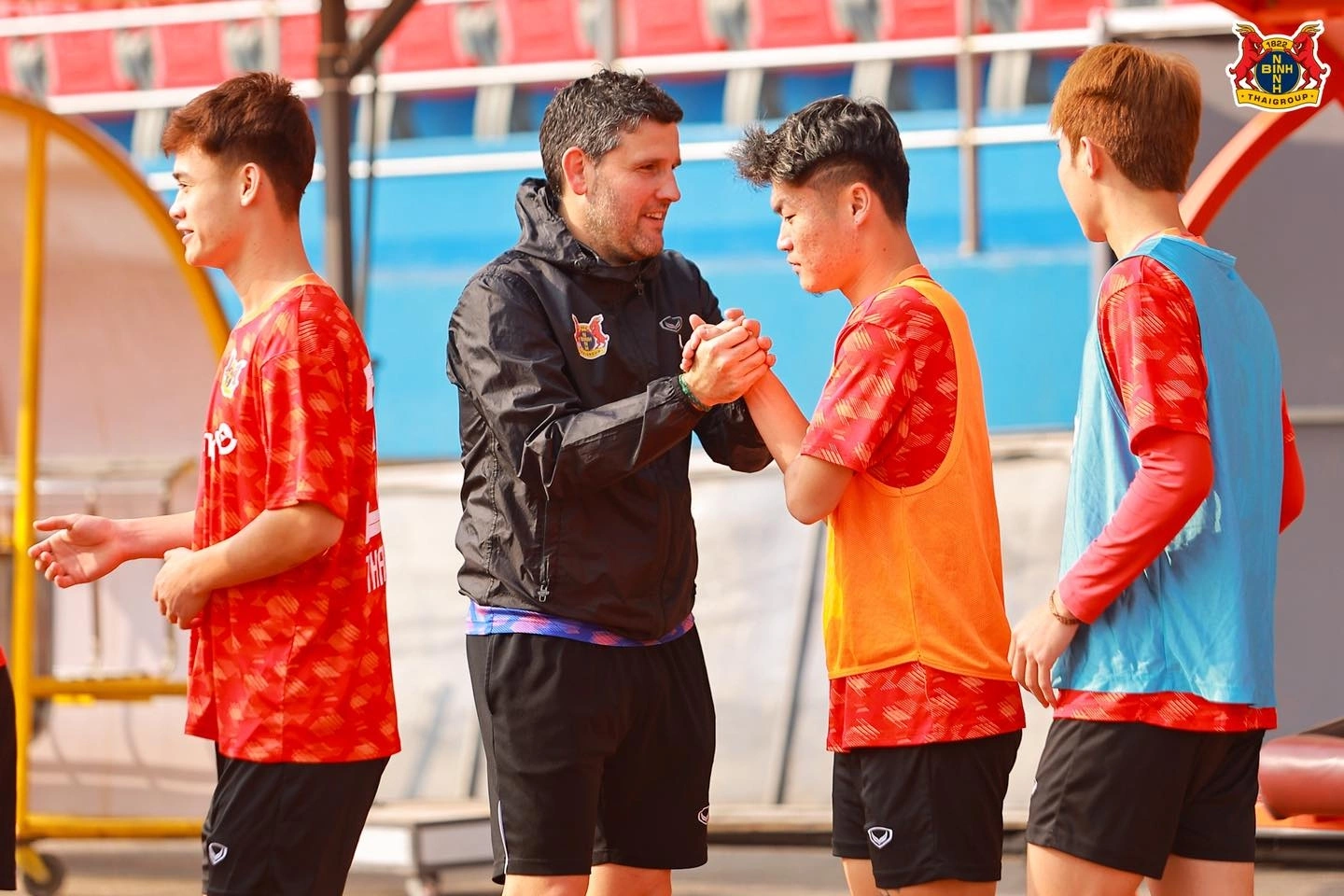 | Huấn luyện viên Gerard Albadalejo (thứ hai từ trái sang) ở buổi tập ngày 20-2-2026. Ảnh: Ninh Bình FC |
