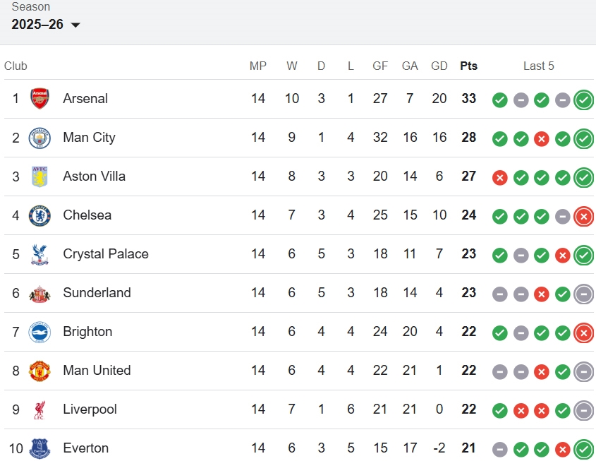 | Bảng xếp hạng Ngoại hạng Anh mới nhất. Ảnh: Google |